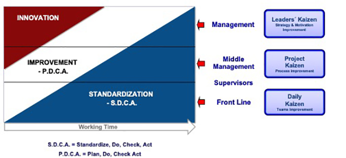 Il modello di riferimento per un’organizzazione “abilitata” al miglioramento continuo è rappresentata dalla figura blu-rossa-bianca che chiamiamo affettuosamente “Kaizen Flag”. Questo modello aiuta a suddividere su tre livelli organizzativi (front line, middle management e management) il tempo assegnato al lavoro svolto in accordo a standard definiti (blu), al miglioramento degli stessi (bianco), all’innovazione (rosso).
