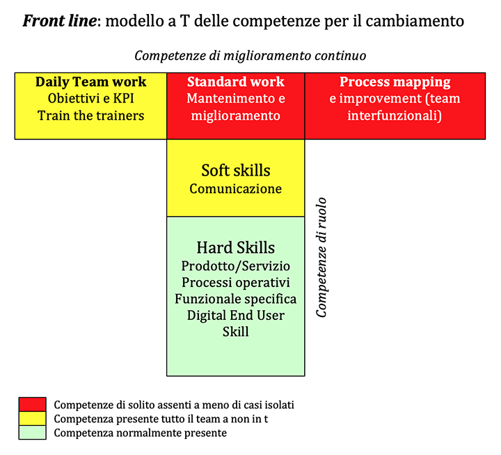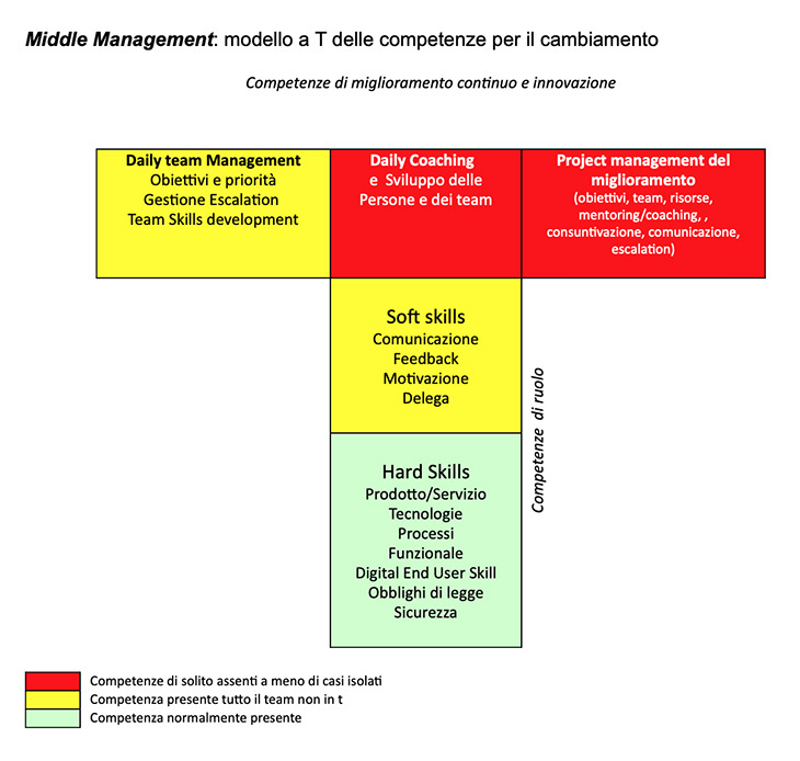 Questo concetto suggerisce di utilizzare il modello a T delle competenze per identificare le competenze funzionali sulla parte verticale e le competenze legate al cambiamento, miglioramento continuo e trasformazione sulla parte orizzontale.