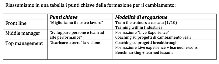 Si tratta di competenze non sviluppabili in lezioni frontali o sessioni di E-learning ma in una modalità più vicina alla bottega rinascimentale dove l’esperienza diretta nel processo di cambiamento, l’erogazione di feedback esperti e la successiva riflessione critica per consolidare le learned lessons, completano i momenti formali di training. Un piano di miglioramento personale consente di applicare i nuovi comportamenti in maniera ripetuta fino a farle diventare competenze. In questo caso la formazione è tanto più efficace se è legata a progetti sul campo, fortemente voluti dalla Direzione e con notevole “esposizione”. La parola chiave è “sviluppare persone e team ad alte performance”, tenendo presente che anche la “fabbrica aumentata” ha bisogno di “persone aumentate”.