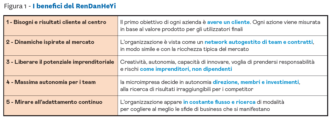 Il crescente interesse per il RenDanHeYi è dovuto alla sua capacità di trovare risposte inedite alle sfide universali con cui milioni di imprese si stanno confrontando e di farlo su scala enorme (80 mila dipendenti e 4 mila microimprese), in un settore legato alla produzione di beni materiali come il manifatturiero ed indipendentemente dal pensiero mainstream di matrice nordamericana. Ciò avviene grazie a pochi costrutti di base, visualizzati nel diagramma in figura 2.