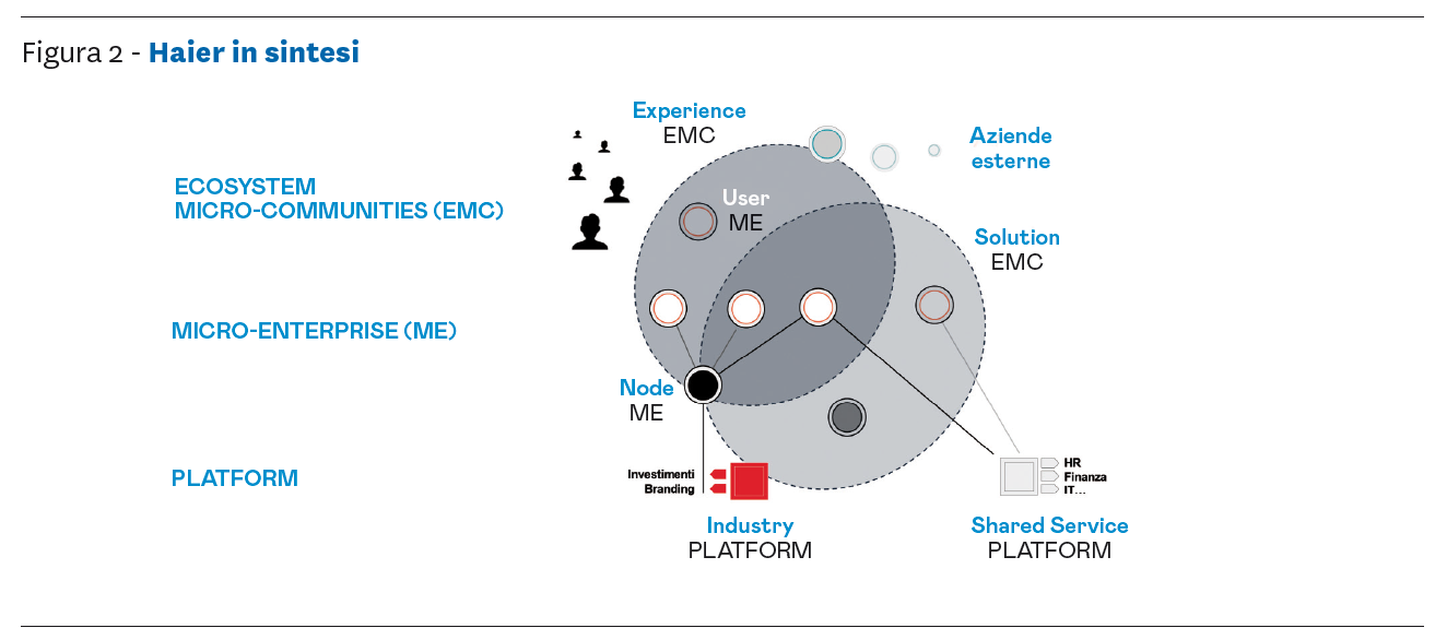 · Le Ecosystem Micro-Community (EMC). Il concetto di EMC è nato per facilitare la collaborazione e la co-creazione di valore tra microimprese. Le EMC si impegnano a rompere i silos aziendali armonizzando il lavoro di ecosistemi di unità a partire da uno scenario utente ed un obiettivo condiviso sfidante. Non si tratta di entità organizzative, ma di contratti lanciati da una microimpresa tramite il suo leader che acquisisce un secondo ruolo, come leader della EMC. Anche le EMC esistono in due tipologie: le "Experience EMC" focalizzate sul miglioramento dell'esperienza dell'utente finale e le "Solution EMC", che forniscono servizi abilitanti. Una volta avviata una EMC, qualsiasi microimpresa o azienda esterna può candidarsi per partecipare, mostrando come intende contribuire alla realizzazione dello scenario utente scelto, le risorse in grado di mettere a disposizione e la quota di profitti (o altri benefici) che richiede in cambio.