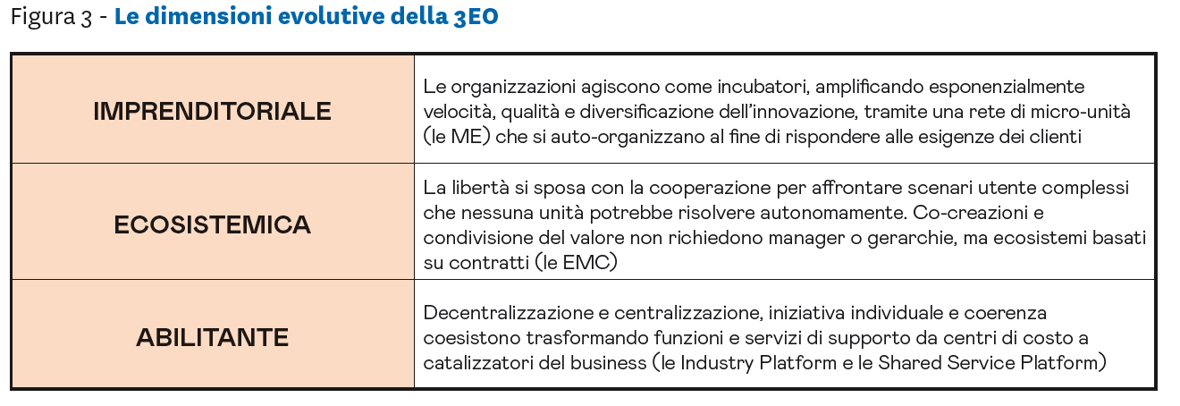 La 3EO generalizza ed inquadra le soluzioni proposte da Haier su tre dimensioni evolutive, affrontabili in modo graduale e modulare dalle singole imprese (figura 3).