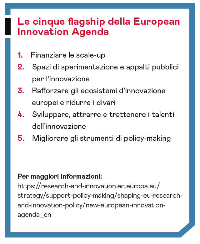 Ecco perchè, accanto al Green Deal, alla strategia industriale “Net-zero”, alle politiche industriali e digitali, o al mega-programma quadro di ricerca “Horizon Europe”, la Commissione europea ha varato un anno fa la “New European Innovation Agenda”[2], un vasto piano d’azione declinato in 25 iniziative concrete, raggruppate in 5 “flagships”. Non si tratta, salvo qualche eccezione, di nuovi fondi europei, ma di creare le condizioni per rafforzare i nostri ecosistemi di innovazione, per valorizzare e attrarre talenti, per mobilitare capitali privati e permettere un maggior accesso al credito per le start-up e le scale-up europee.