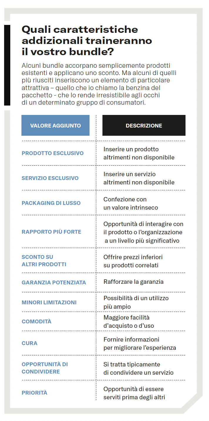 Consiglio alle aziende che stanno riflettendo su tali quesiti di pensare alle preferenze dei loro consumatori target e ai tipi di elementi a valore aggiunto che potrebbero inserire. La benzina di un bundle mirato alle famiglie, oppure agli anziani, o ancora ai cultori del prodotto o ai clienti business può essere molto diversa. A seconda della categoria di prodotto, le famiglie possono apprezzare un programma di sostituzione dell'usato (man mano che i figli crescono); gli anziani una garanzia o un servizio di riparazione con consegna via posta (che alleggerisce i fastidi dell'operazione); un appassionato del prodotto potrebbe desiderare di visitare le strutture produttive o di partecipare ai test sulle versioni beta di nuovi articoli, mentre un cliente business apprezzerà un accesso prioritario al servizio clienti o a eventi esclusivi. Se un'azienda si rivolge a segmenti di mercato diversi, può variare le caratteristiche dei bundle per aumentarne l'attrattiva per gruppi specifici (si veda il box alla pagina successiva).
