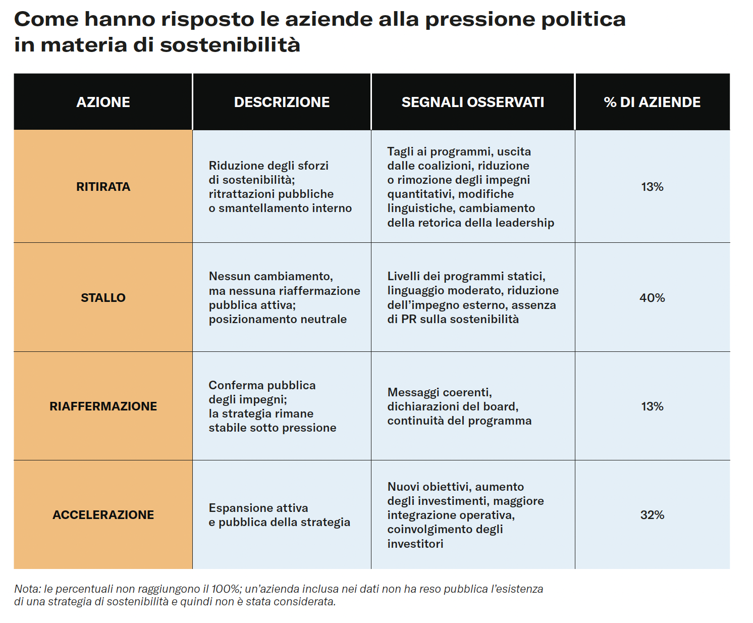 In uno studio, abbiamo monitorato i cambiamenti strategici di 75 aziende globali, tra cui le prime 25 aziende per capitalizzazione di mercato nell'S&P 100, nello STOXX Europe e nella Fortune 500, da aprile 2024 a maggio 2025. In combinazione con le informazioni raccolte da 15 interviste con esperti, abbiamo verificato come le aziende stanno adattando le loro strategie di sostenibilità. Questo set di dati costituisce una delle prime analisi complete e tempestive di come la pressione politica stia attivamente rimodellando la strategia aziendale in tempo reale, fornendo un'istantanea ad alta risoluzione del panorama che i consigli di amministrazione e i gruppi dirigenti si trovano ad affrontare oggi.