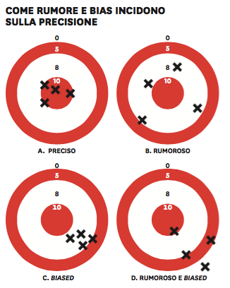 Quando le persone considerano gli errori di giudizio e decisionali, probabilmente pensano ai bias sociali, come gli stereotipi sulle minoranze, oppure a quelli cognitivi, come l'eccesso di fiducia e l'ottimismo infondato. La variabilità inutile che chiamiamo rumore è un errore di tipo diverso. Per coglierne la specificità, pensate alla bilancia che avete in bagno. Potremmo dire che la bilancia è "biased" se le letture sono generalmene troppo alte o troppo basse. Se il vostro peso sembra dipendere da dove appoggiate i piedi, la bilancia è "rumorosa". Una bilancia che sottostima in modo coerente il peso reale di esattamente due chili è gravemente biased, ma priva di rumore. Una bilancia che dà due letture diverse quando ci salite sopra due volte è rumorosa. Molti errori di misurazione derivano da una combinazione di bias e rumore. La maggior parte delle bilance economiche da bagno è in qualche modo biased e molto rumorosa.