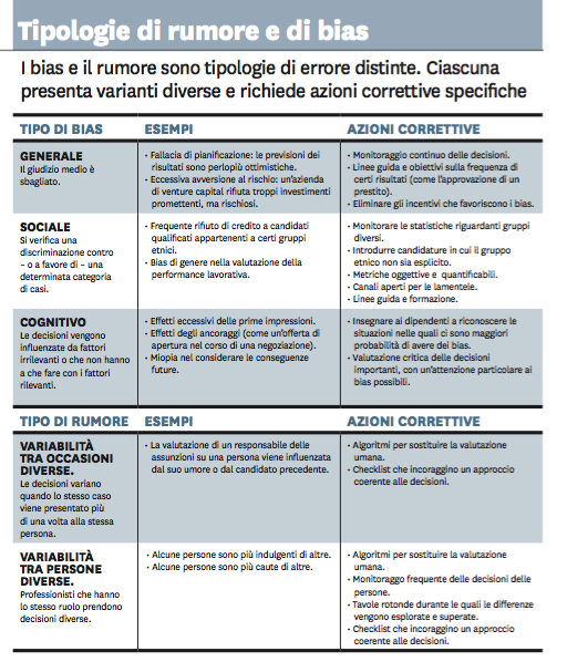 L'OBIETTIVO PRINCIPALE di questo articolo è quello di far conoscere ai manager il concetto di rumore come origine di determinati errori e spiegare come il rumore sia diverso dal bias. Il termine "bias" è entrato nella coscienza pubblica al punto che spesso i termini "errore" e "bias" vengono utilizzati in modo intercambiabile. In realtà, una migliore qualità decisionale non viene raggiunta semplicemente riducendo i bias generali (come l'ottimismo) o quelli sociali e cognitivi specifici (come la discriminazione delle donne o gli effetti di ancoraggio). I dirigenti che hanno a cuore l'accuratezza dovrebbero anche fare i conti con la prevalenza dell'incoerenza nei giudizi professionali. Il rumore è più difficile da cogliere dei bias, ma non è meno reale o meno costoso.