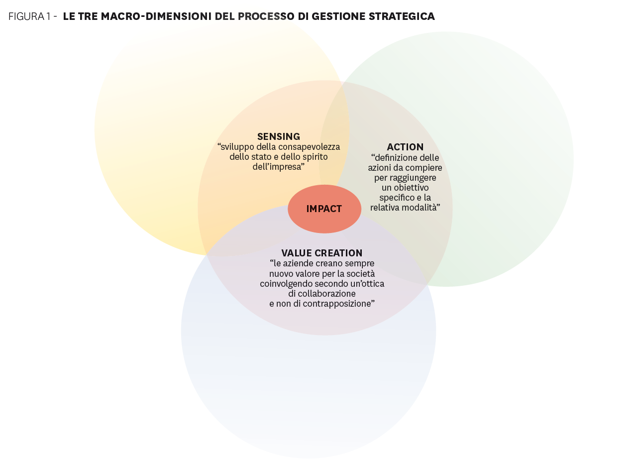 In particolare, i risultati dimostrano che questo avviene principalmente in tre macro-dimensioni separate (figura 1) appartenenti a tre fasi distinte del processo di gestione strategica dell’organizzazione necessarie per raggiungere e sostenere il vantaggio competitivo dell’impresa.