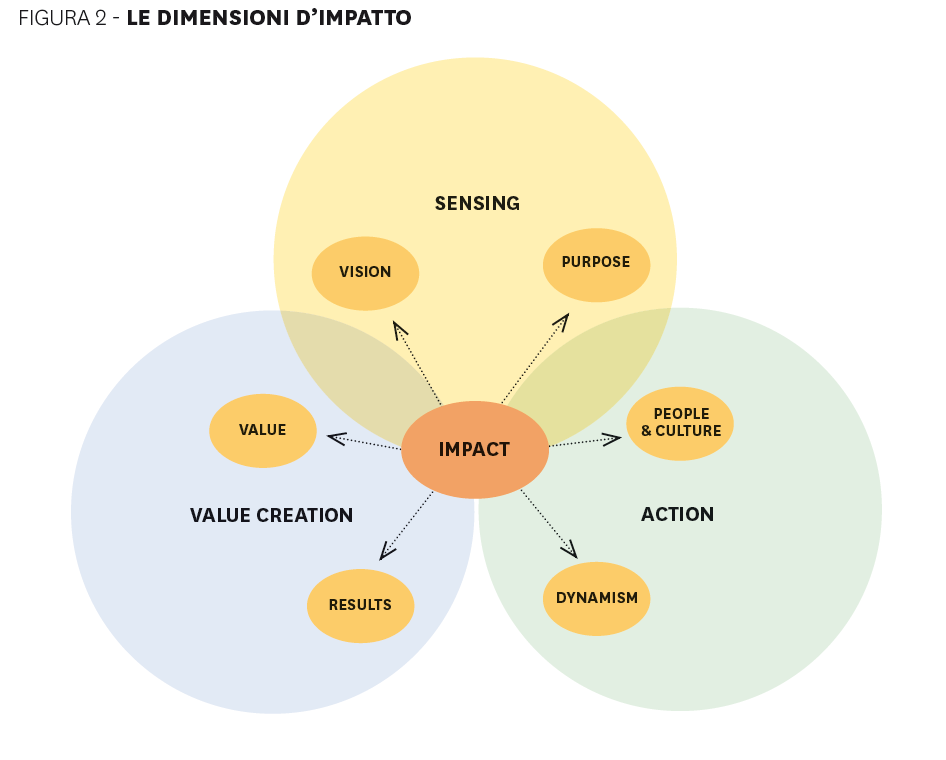 - La dimensione “action” cioè la definizione delle azioni da compiere per raggiungere un obiettivo specifico e la relativa modalità. Qui possiamo identificare le sottodimensioni “People & Culture”, aspetto critico dell’impresa soprattutto nel modo in cui l’impresa favorisce l’innovazione attraverso i suoi processi e le persone, e “Dynamism”, la capacità di un’impresa di essere dinamica nella sua relazione con il mondo circostante e i suoi attori. Questa dimensione appartiene alla fase di strategy del processo di gestione strategica.