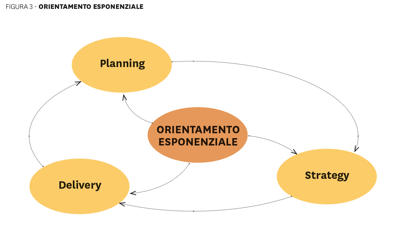 I casi di utilizzo della metodologia studiati rivelano esperienze profonde, complete e trasformative che hanno permesso alle imprese di acquisire un vero e proprio Orientamento Esponenziale, una capacità di inserire logiche ad impatto esponenziale in tutte e tre le fasi del processo di gestione strategica (figura 3).