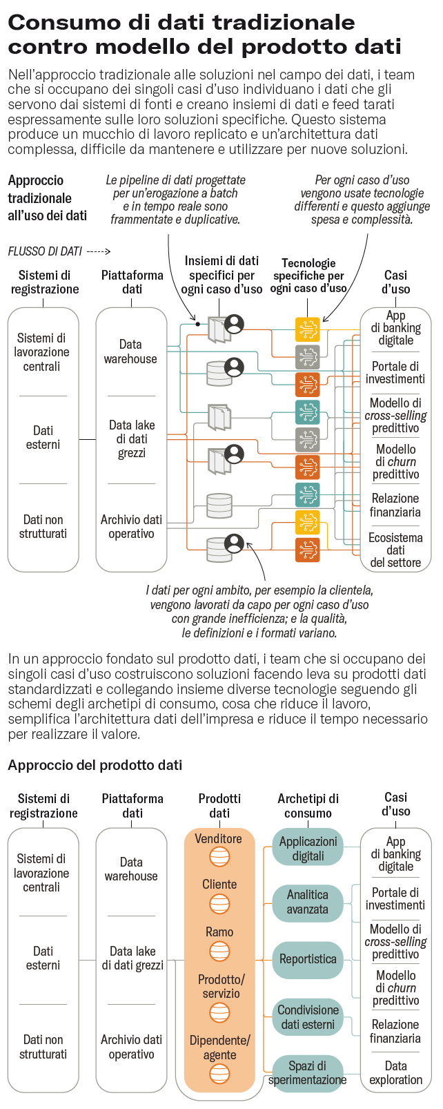 I prodotti dati si basano sugli archivi dati operativi esistenti, come data warehouse (serbatoi di dati strutturati) e data lake. (Si veda il riquadro “Consumo tradizionale di dati contro modello del prodotto dati”.) I team che li usano non devono sprecare tempo a cercare i dati, elaborarli nel formato giusto e costruire insiemi di dati personalizzati e pipeline di dati (che a lungo andare creano un pasticcio architettonico e problemi di governance).