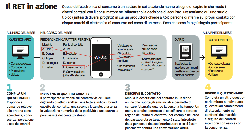 Il RET nasce da due considerazioni. La prima che, mentre un ricercatore di mercato non può facilmente seguire i consumatori 24 ore al giorno, i loro telefoni cellulari invece lo possono fare e inoltre, a differenza degli osservatori in carne e ossa, non alterano la percezione che la persona ha della propria esperienza. La seconda considerazione si basa sul fatto che i clienti possono interagire con un’azienda in migliaia di modi ma di ogni contatto serve veramente conoscere solo quattro aspetti: il marchio coinvolto, il punto di contatto (poniamo uno spot televisivo o una chiamata al centro di assistenza), come il cliente ha vissuto l’esperienza e quanto questa sia stata persuasiva (lo ha reso più incline a scegliere quel marchio alla prossima occasione?).