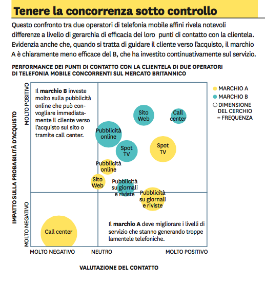 L’analisi competitiva. È possibile anche valutare l’efficacia nell’indirizzare i comportamenti e plasmare gli atteggiamenti dei propri punti di contatto in confronto a quelli della concorrenza. Una buona visualizzazione di questi risultati si ottiene con una matrice dell’impatto dei punti di contatto come quella presentata nel box “Tenere la concorrenza sotto controllo”, in cui viene confrontata l’efficacia di due operatori britannici di telefonia mobile su cinque punti di contatto. Ne emerge che, benché gradita, la pubblicità televisiva e sulla stampa del marchio A ha un impatto soltanto limitato sugli acquisti perché molti consumatori sentono anche commenti negativi da parte di chi è già cliente ed è insoddisfatto del rivestimento, della confezione e dell’assistenza. Per il marchio B c’è invece meno passaparola ma quello che c’è è estremamente positivo. È evidente che gli investimenti promozionali del primo marchio sono destinati a essere scarsamente efficaci finché non verranno risolti i problemi relativi al servizio ed è dunque saggio dirottarli dal marketing verso le attività operative e il servizio clienti.