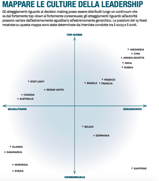 Molti dirigenti e manager danno per scontato che in società più gerarchiche le decisioni verranno prese dal capo che sta al vertice e che in società più egualitarie le decisioni verranno raggiunte attraverso il consenso di gruppo. Eppure, se consideriamo una scala mondiale, scopriamo che le gerarchie e i metodi di decision making non sono sempre correlati.