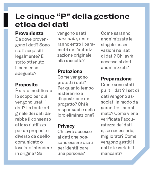 Quando esaminano nuovi progetti che comportano l’uso di dati forniti da esseri umani o attinti alle banche dati esistenti, le aziende devono focalizzarsi su cinque aspetti essenziali: la provenienza dei dati, il proposito (purpose) per cui saranno utilizzati, come sono protetti, come viene tutelata la privacy dei fornitori dei dati e come vengono preparati i dati per l’utilizzo. Chiamiamo questi aspetti “le cinque P” (vedi il riquadro “Le cinque P della gestione etica dei dati”). In queste pagine esamineremo ciascuno di questi aspetti e vedremo come le tecnologie basate sull’IA aumentino il rischio di un uso improprio dei dati. Innanzitutto, però, forniamo una breve descrizione dei requisiti organizzativi per un’efficace procedura di valutazione etica.