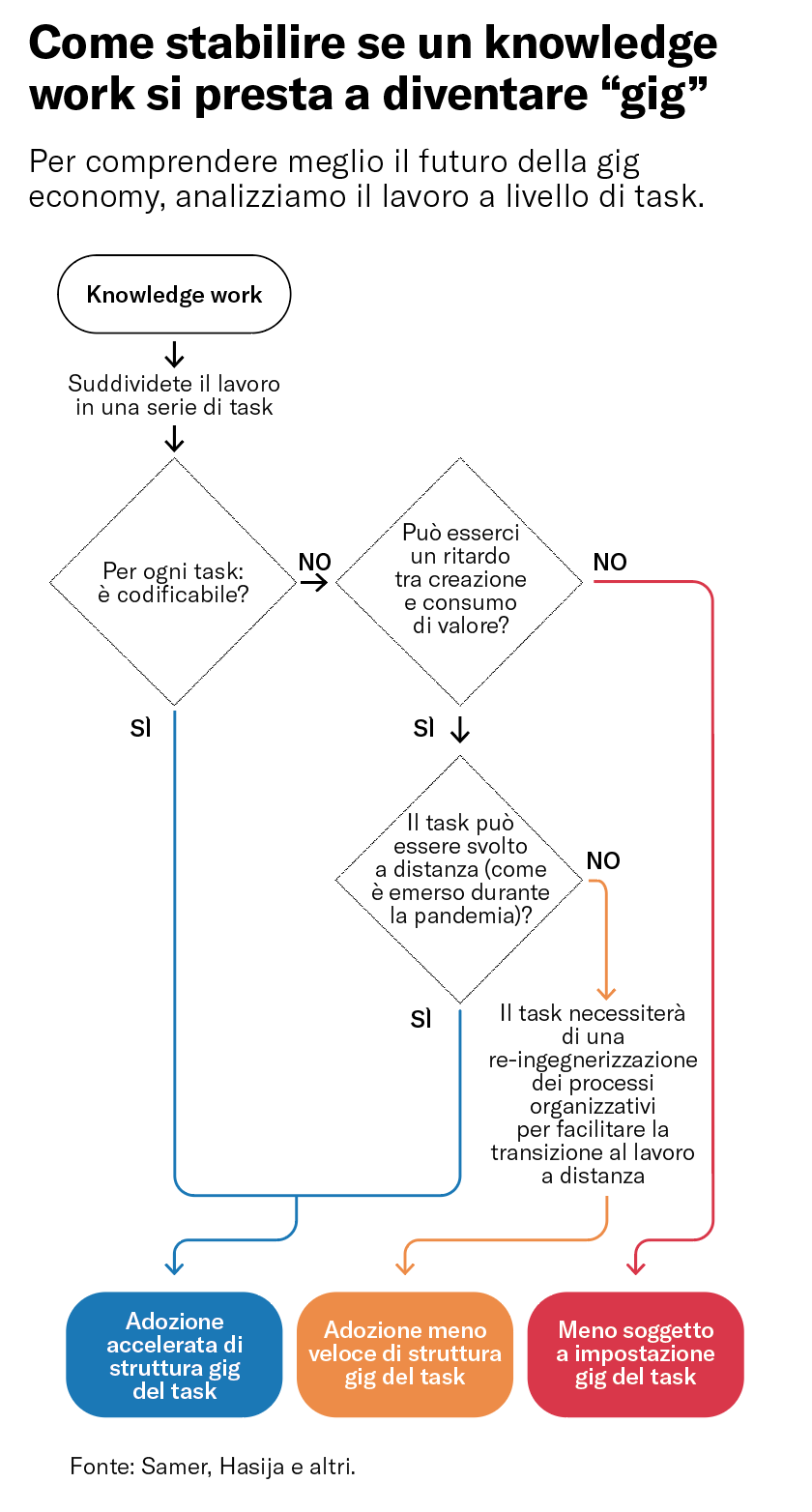 L’epidemia di Covid-19 potrebbe rivelarsi un punto cruciale nella “gigificazione” del lavoro intellettuale e molte aziende saranno attratte dalle prospettive di risparmio diretto e indiretto che il modello della gig economy sembra offrire. Ma, data la complessità dei lavori della conoscenza, c’è anche il rischio di un’estensione eccessiva e di uno spreco di investimenti. La semplice categorizzazione basata sui task che proponiamo aiuterà i manager a fare scelte più intelligenti su quali compiti debbano essere assegnati ai gig-lavoratori.